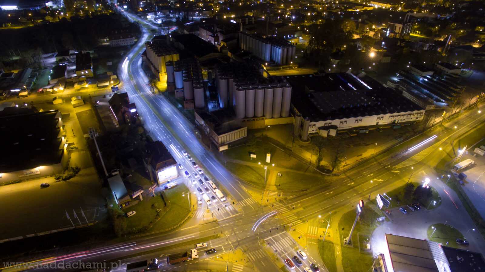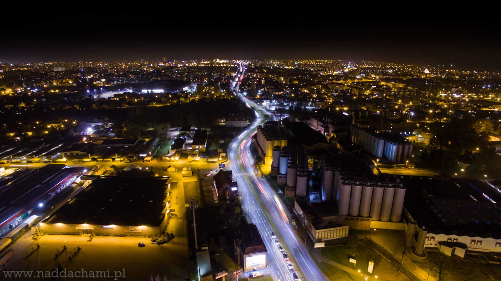 Nocne, majestatyczne zdjęcia z powietrza w Tychach. Widok na Tyskie Browary Książęce z lotu ptaka.